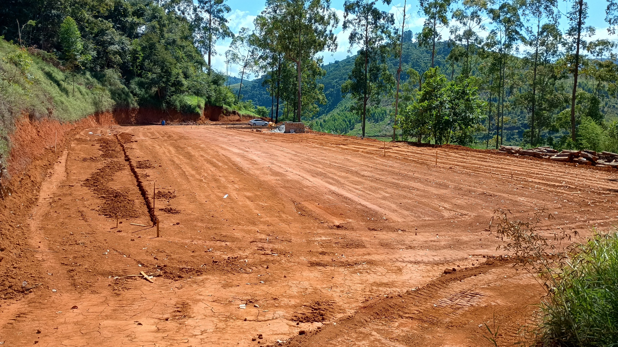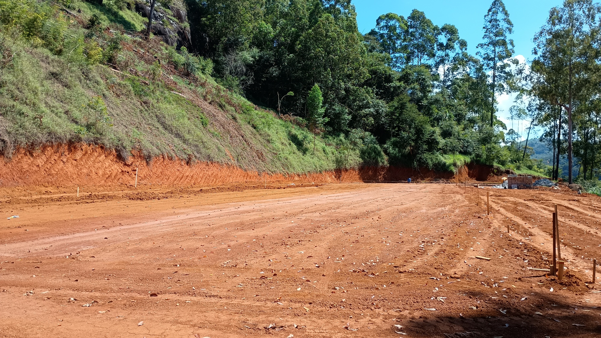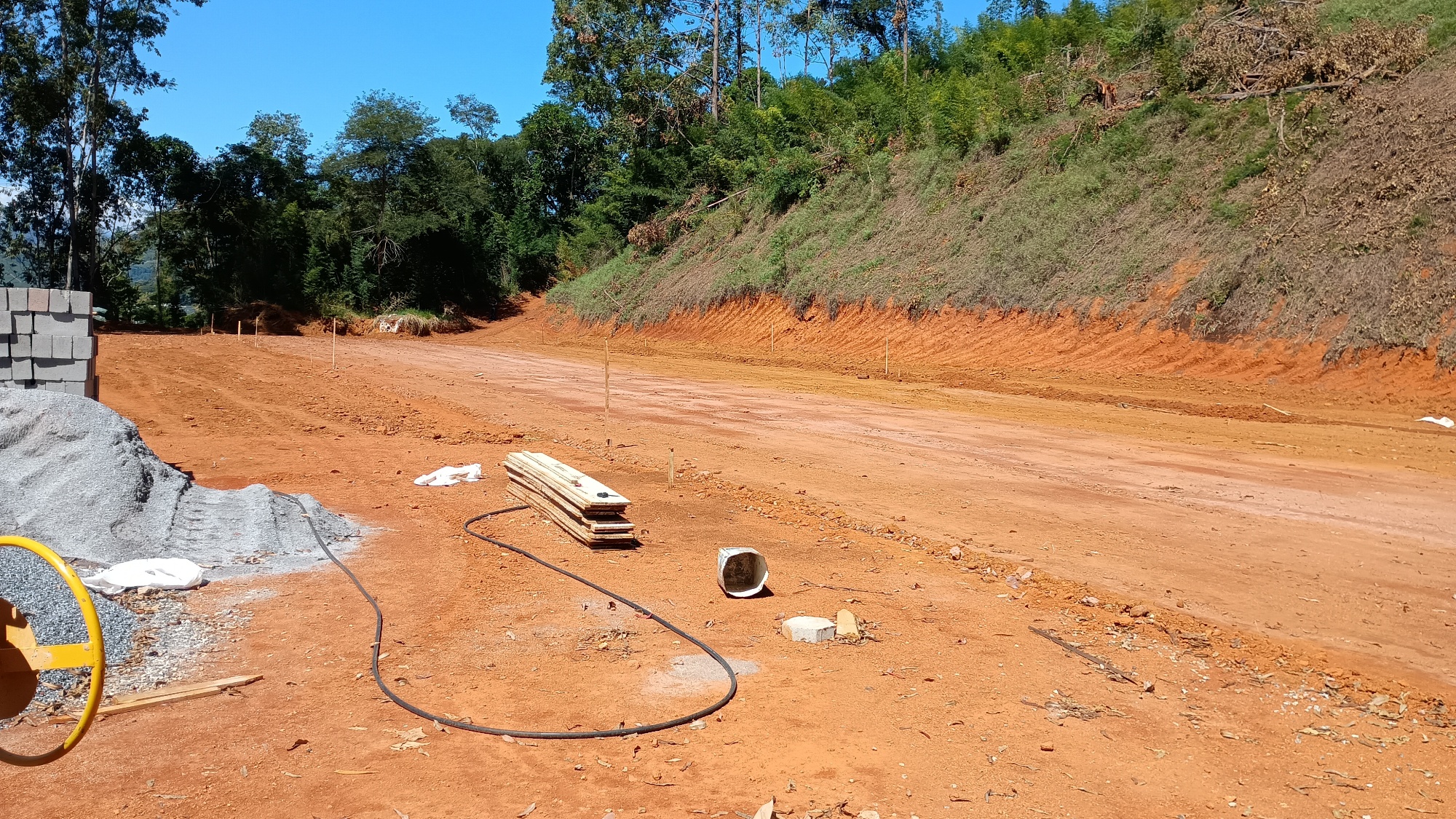 Atualmente, os trabalhos estão concentrados na preparação do terreno, incluindo nivelamento e estruturação da base. As próximas etapas envolvem a aplicação do saibro, compactação e a implantação do sistema de drenagem, composto por brita e pó de brita.