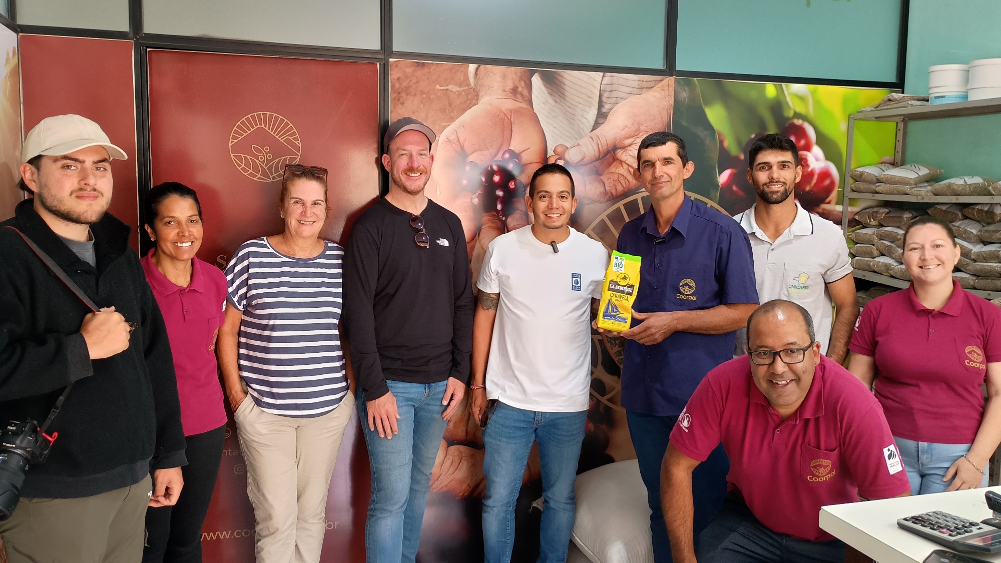 Após a visita na sede da COORPOL, a comitiva seguiu para as propriedades cafeeiras, onde, acompanhada do Presidente Flânio Alves e da equipe da cooperativa, percorreu lavouras, conversou com cafeicultores e conheceu de perto a cadeia de produção e de comercialização do café, tão bem apreciado na Europa e em todo o mundo.