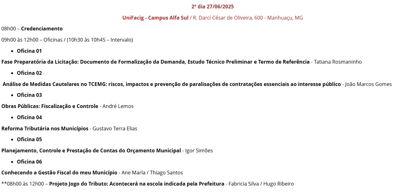 Na sexta-feira, 27 de junho, as oficinas serão realizadas na Unifacig – Campus Alfa Sul, rua Darci César de Oliveira, 600, Manhuaçu. Os temas abordarão a Fase Preparatória da Licitação: Documento de Formalização da Demanda, Estudo Técnico Preliminar e Termo de Referência; a Análise das Medidas Cautelares no TCEMG: riscos, impactos e prevenção de paralisações de contratações essenciais ao interesse público; os Contratos de Obras Públicas; a Reforma Tributária nos Municípios; o Planejamento, Controle e Prestação de Contas do Orçamento Municipal; e, o tema Conhecendo a Gestão Fiscal do meu Município.