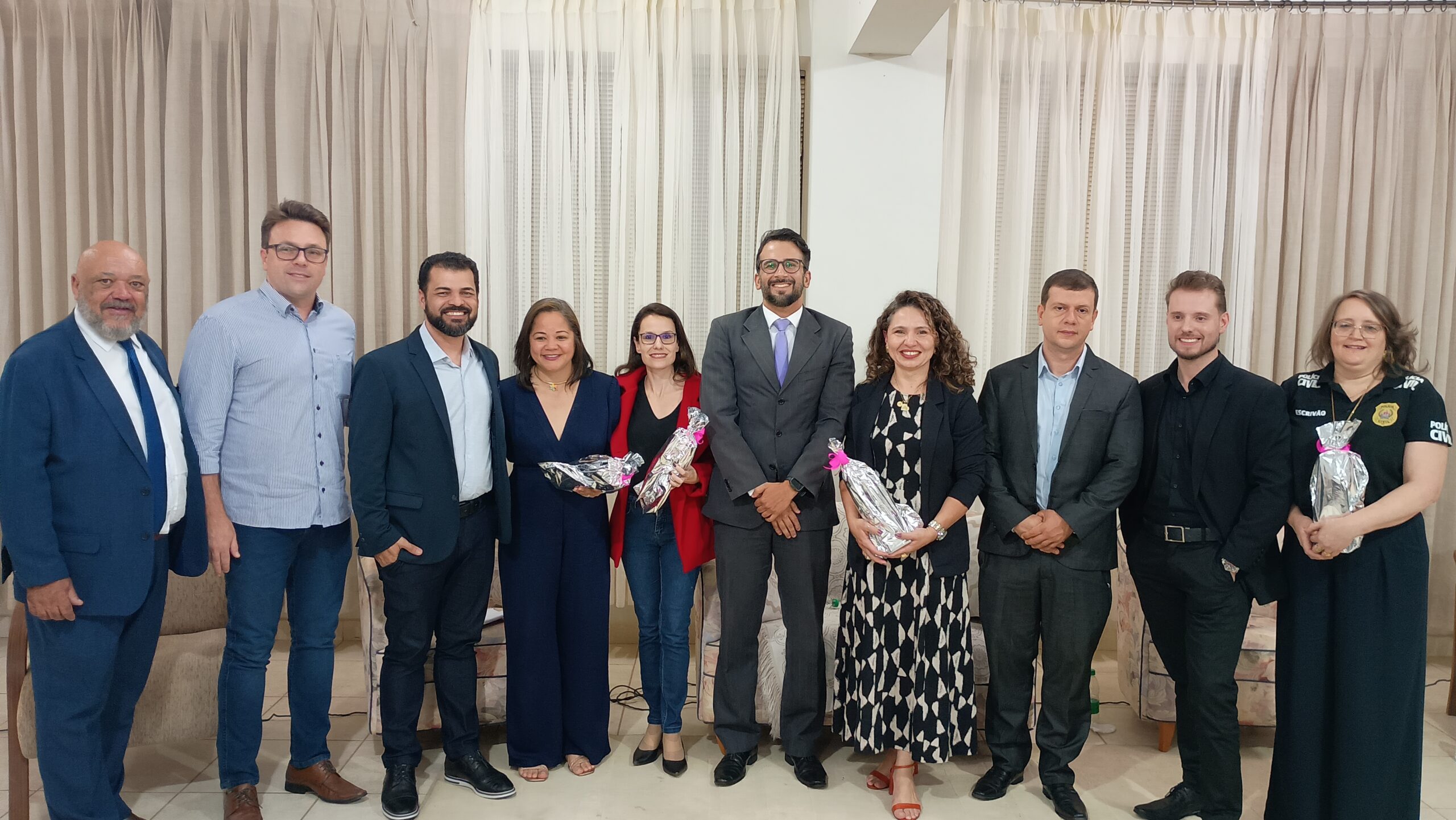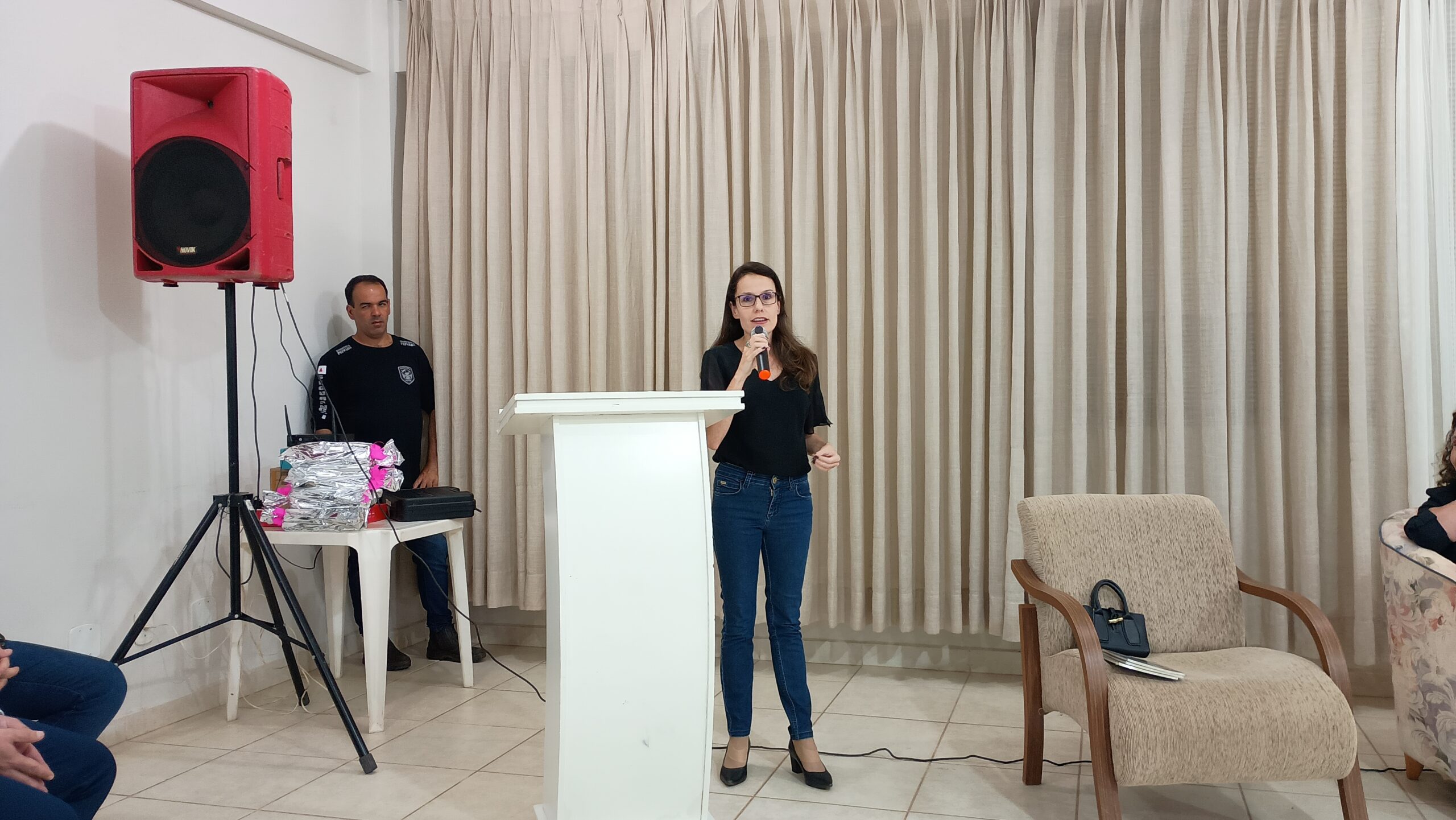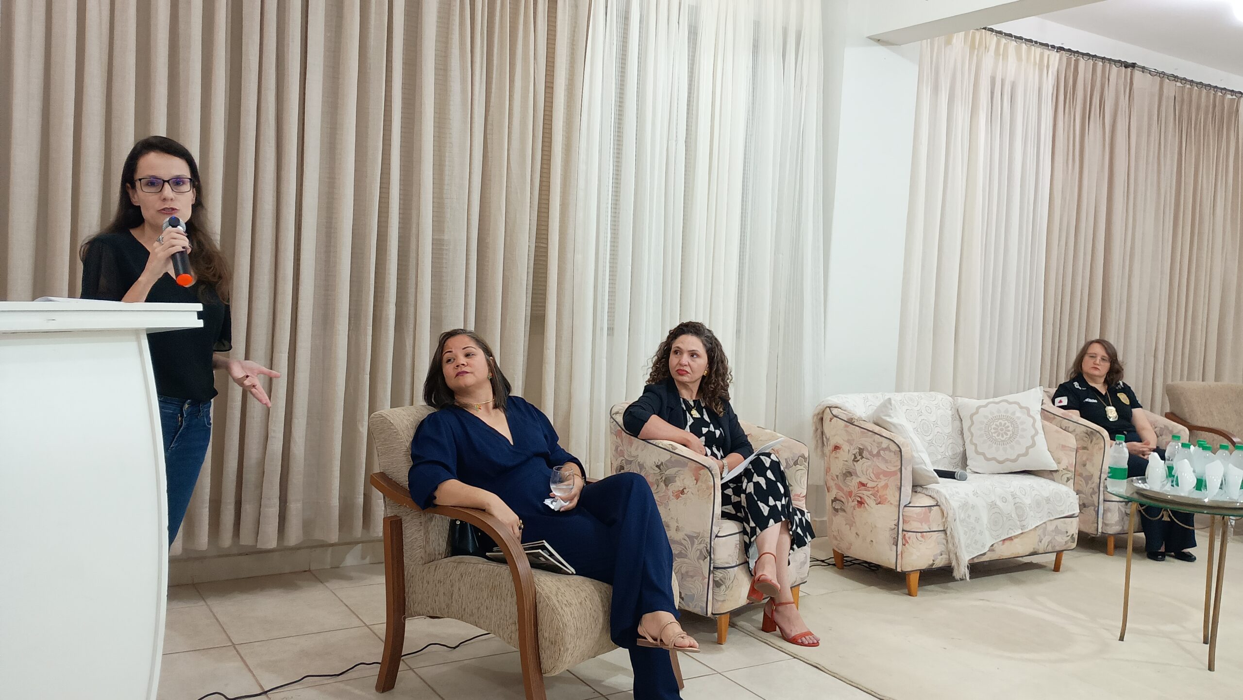 Na abertura do encontro, a Vice-diretora Marisa Salazar, acompanhada do Coordenador do Curso de Direito, Dr. Aluer Baptista Freire Júnior, e de professores da instituição, acolheu aos palestrantes convidados: a psicóloga e escritora, Maralins Lopes Rezende (Tema: Violência Psicológica); advogada e colaboradora jurídica do Coletivo Mães na Luta, Dra. Letícia Schots (Violência Patrimonial e Econômica); assistente social do TJMG, Leslie de Moraes (Violência Física), e a escrivã da Polícia Civil de Manhumirim, Elenice Souza Tuelher Andrade (Feminicídio).