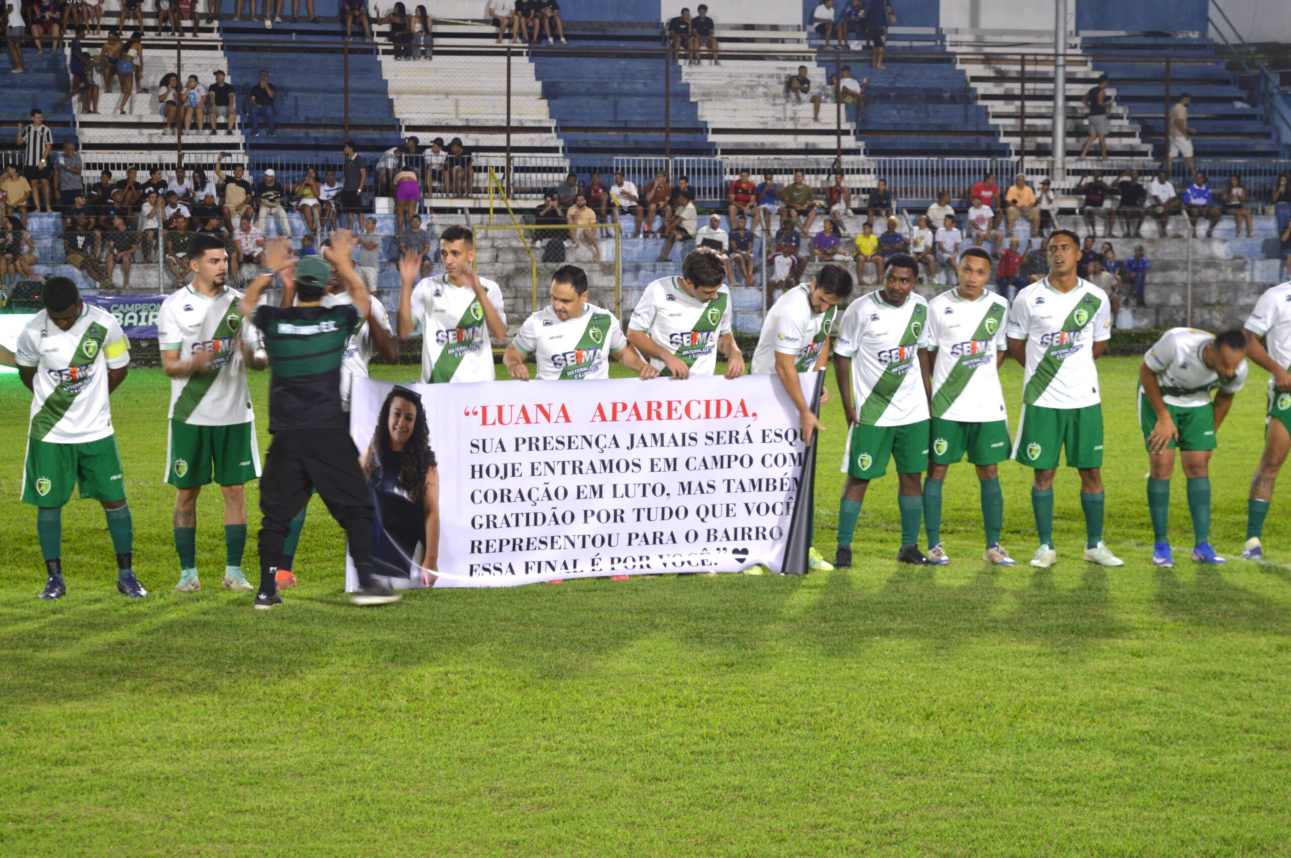 Um dos momentos mais marcantes da tarde ocorreu durante a entrada da equipe do bairro Matinha, nas duas categorias. Os jogadores prestaram uma homenagem emocionante a Luana Aparecida, moradora do bairro que faleceu tragicamente na última quarta-feira (08/04). O gesto de carinho e solidariedade uniu as torcidas, mostrando que o futebol vai muito além das quatro linhas.